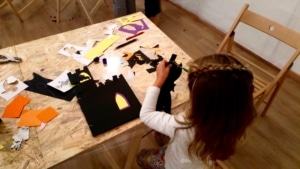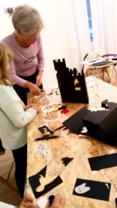 Ci siamo trovati (sì, anche noi!) davanti a dei semplicissimi pezzi di cartoncino. Ma passo a passo, con molta pazienza e tantissime idee, Magda ha guidato grandi e piccini a costruire quelli che sotto gli occhi di tutti sono diventati dei veri e propri libri a forma di castello, che una volta aperti però hanno rivelato di essere abitati da, fantasmi, zucche, pipistrelli… e tutto ciò che la fantasia ci ha suggerito!